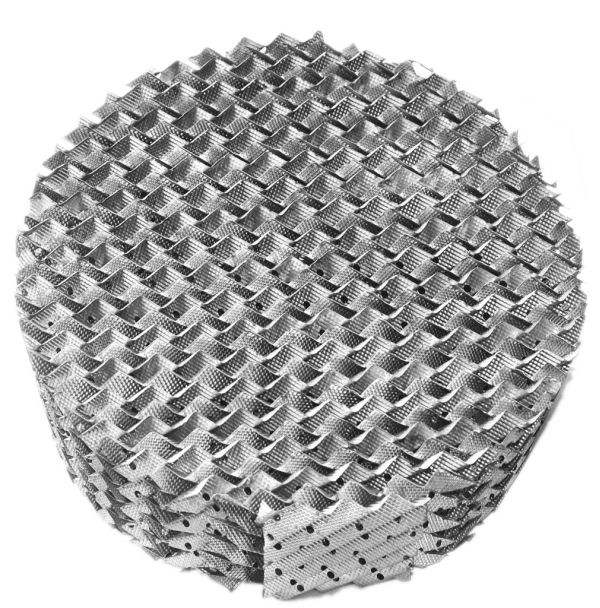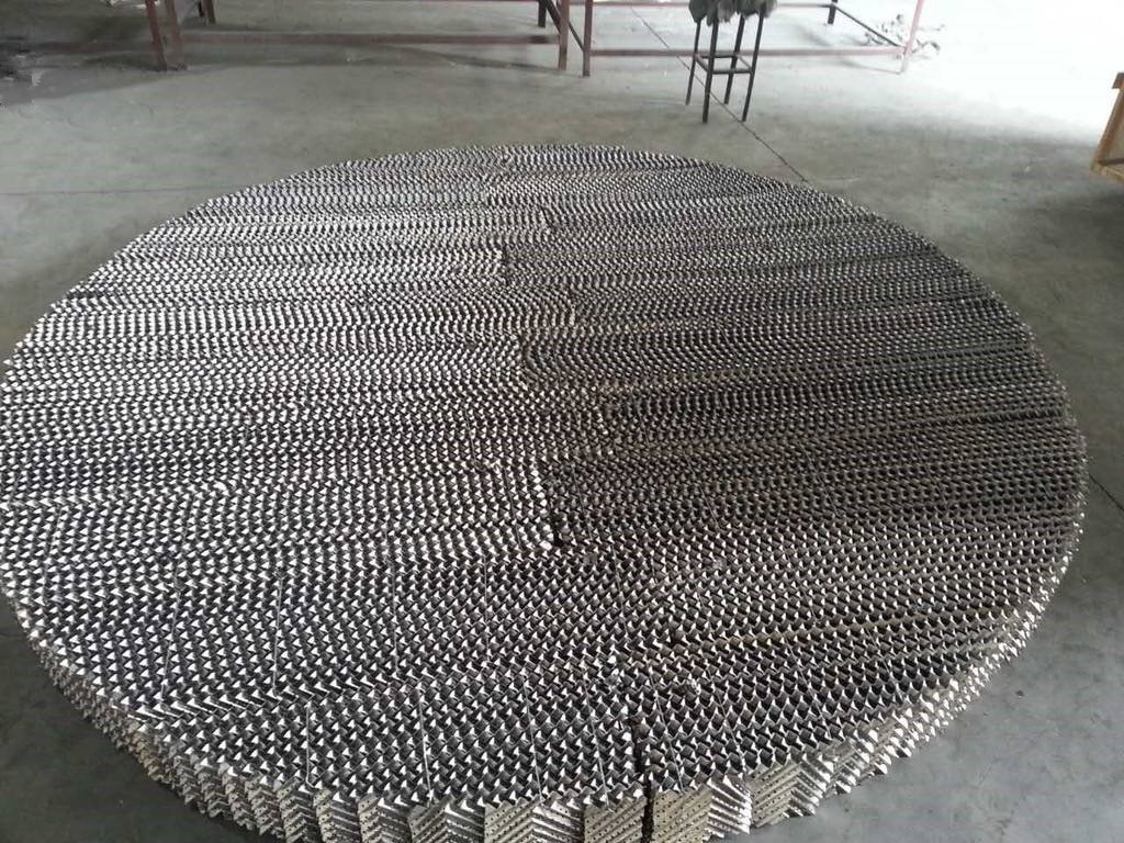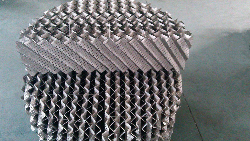 該填料的波紋板片上沖壓有許多f5mm左右的小孔,可起到粗分配板片上的液體、加強橫向混合的作用、波紋板上軋成細小溝紋,可起到細分配板片上的液體、增強表面潤濕性能的作用。金屬板波紋填料強度高,耐腐蝕性強。