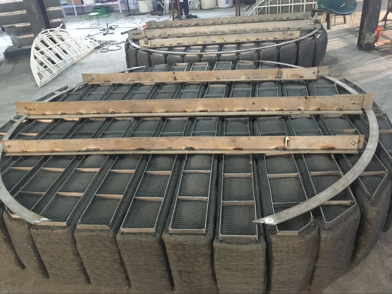 上裝式的選用:當(dāng)入孔位置開設(shè)在絲網(wǎng)除沫器的上放,或無入孔而有設(shè)備法蘭時,選用上裝式絲網(wǎng)除沫器。入孔位置設(shè)在絲網(wǎng)除沫器下放即選用下裝式絲網(wǎng)除沫器。